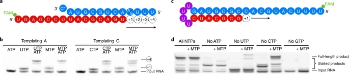 a, The RNA template–product duplex (as in Fig. 1c) allows for RNA extension by four nucleotides. The direction of RNA extension is indicated. The 5′ end of the RNA product contains a FAM fluorescent label. C* at the 3′ end of the template indicates dideoxy-C (ddC). b, RNA elongation to the end of the template in a is possible when MTP replaces either CTP or UTP in the presence of adenosine triphosphate (ATP). The experiment was performed once. c, The RNA template–product hairpin duplex allows for RNA extension by 11 nucleotides. d, RNA elongation stalls at the expected positions when the cognate NTP is withheld from the reaction. Extension to the end of the template is possible when MTP replaces either CTP or UTP in the presence of other substrate NTPs, showing that incorporation of M does not prevent RNA extension. Note that more efficient RNA extension is seen at higher NTP/MTP concentrations, and also for MTP replacing UTP (not shown). The experiment was performed once. Uncropped gel images for b and d are available as source data.